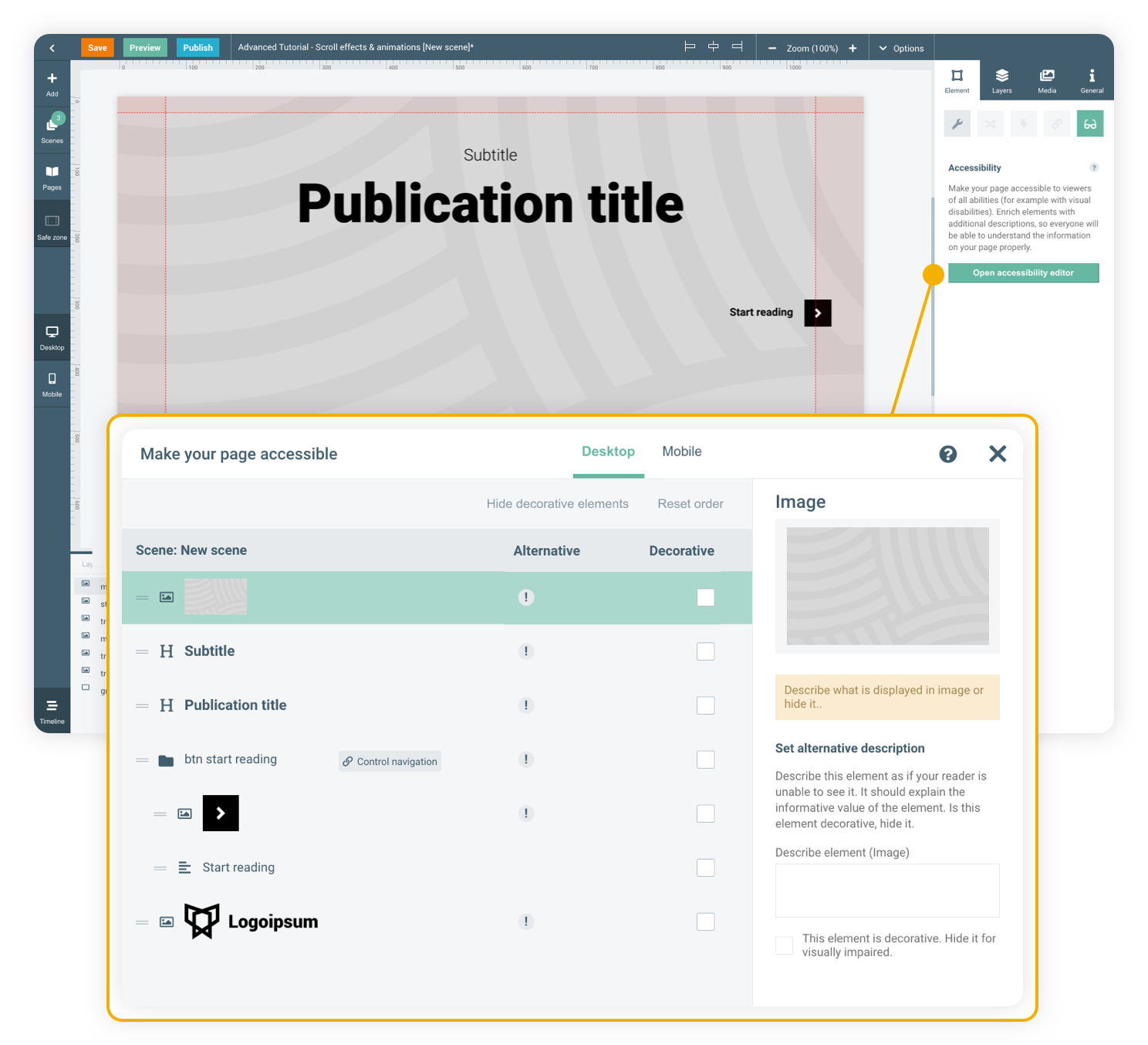 Ensuring the content you create is accessible to viewers of all abilities is of high importance to us. That’s why we’ve added accessibility options for each element you add to your publication. Maglr can be used to create accessible online magazines that comply with WCAG 2.1 guidelines.