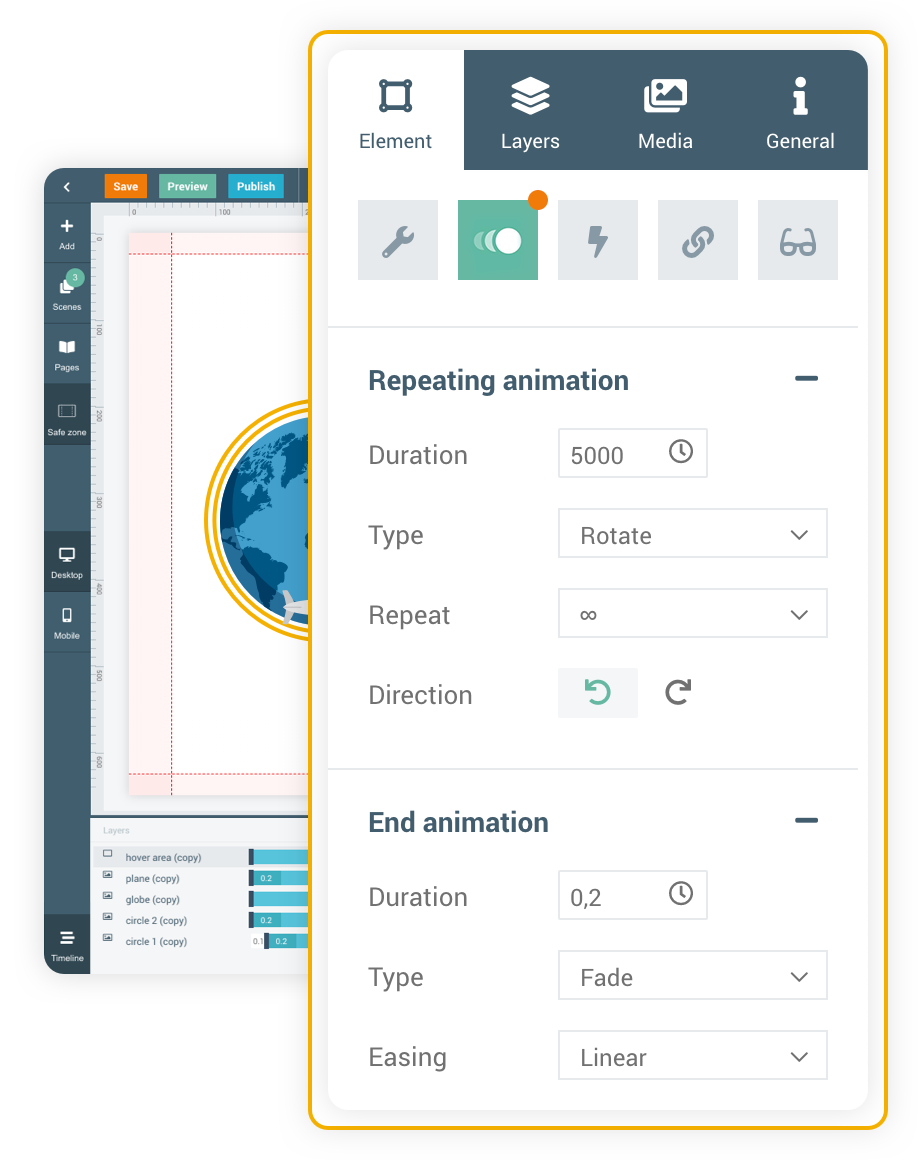 This next button uses animations to make the elements move around the globe as the viewer interacts with it.