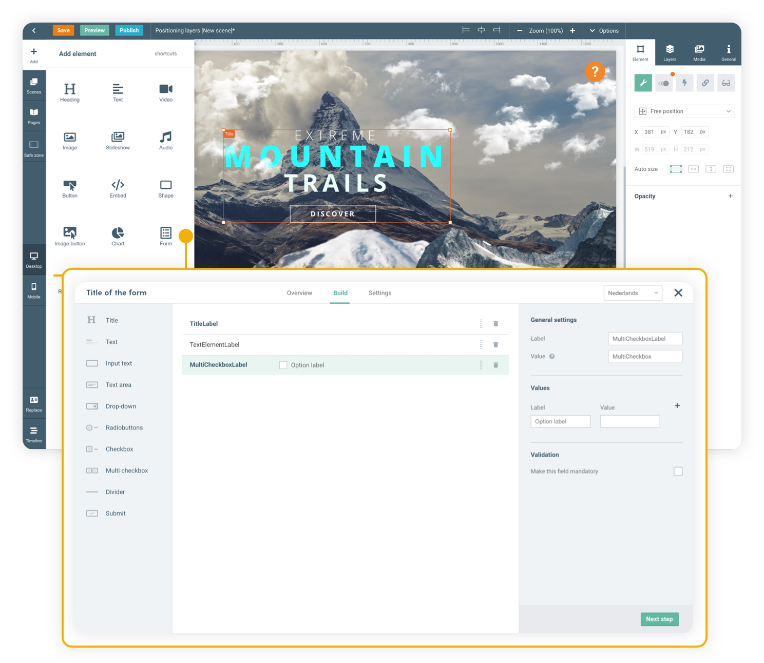 Drag in the Form element to start creating your form. Select a new form and drag in form components to build it from scratch. In the settings panel, you can further design your form and determine what should happen with the incoming responses.