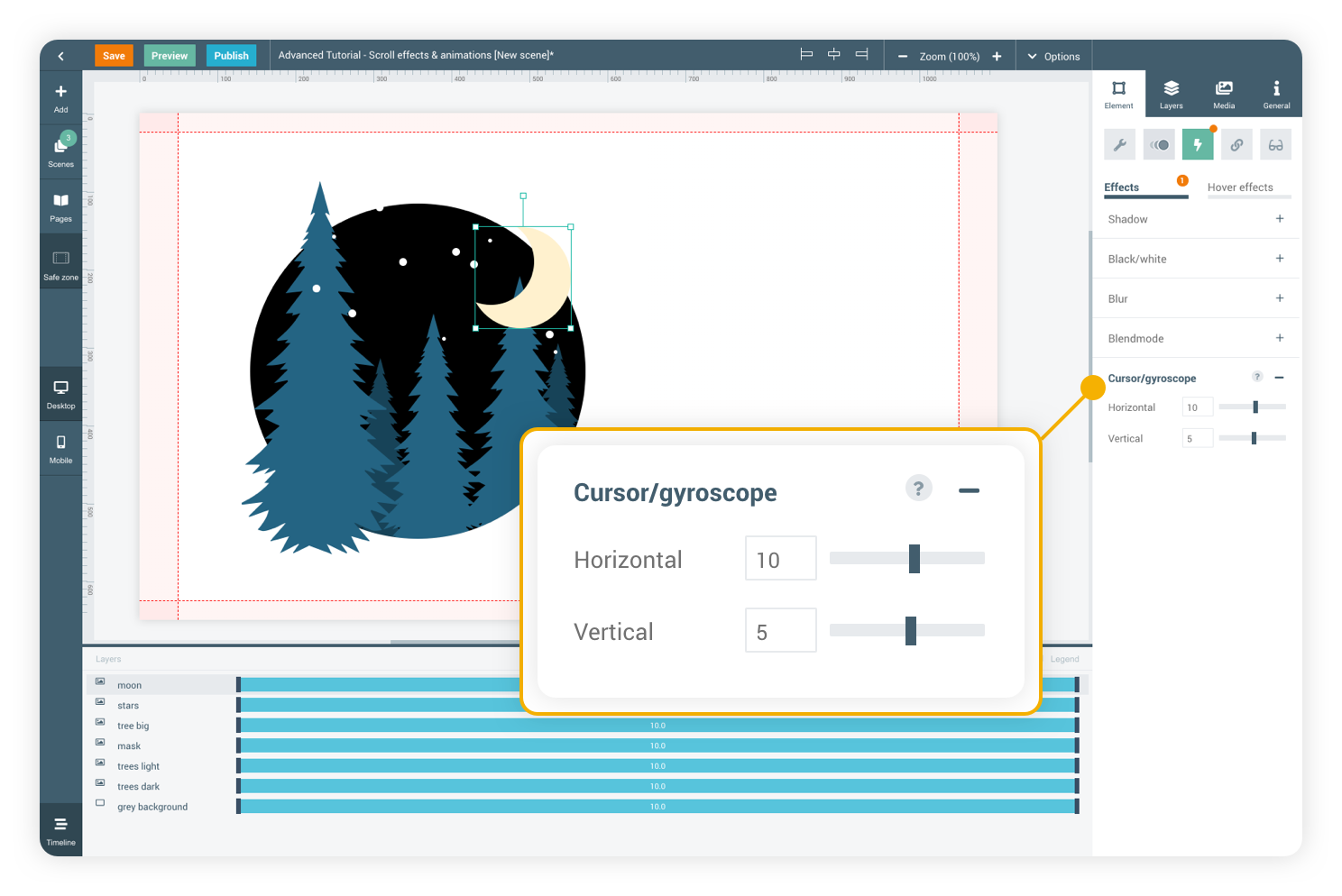 Gyro effects & scroll animations respond directly to the behaviour of your viewers, making them a great way to add interactivity and dimension to your page.