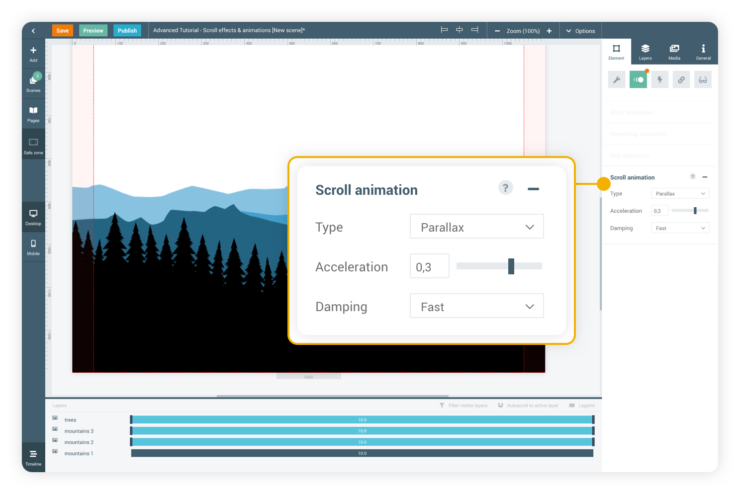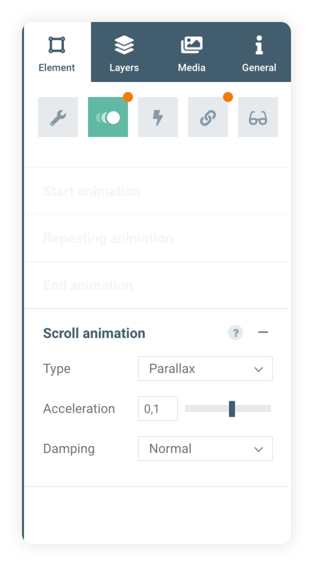 Scroll animations respond to the scrolling behaviour of your viewer, and are therefore only available on longpages. These animations play forwards when scrolling down, and backwards when scrolling back up.