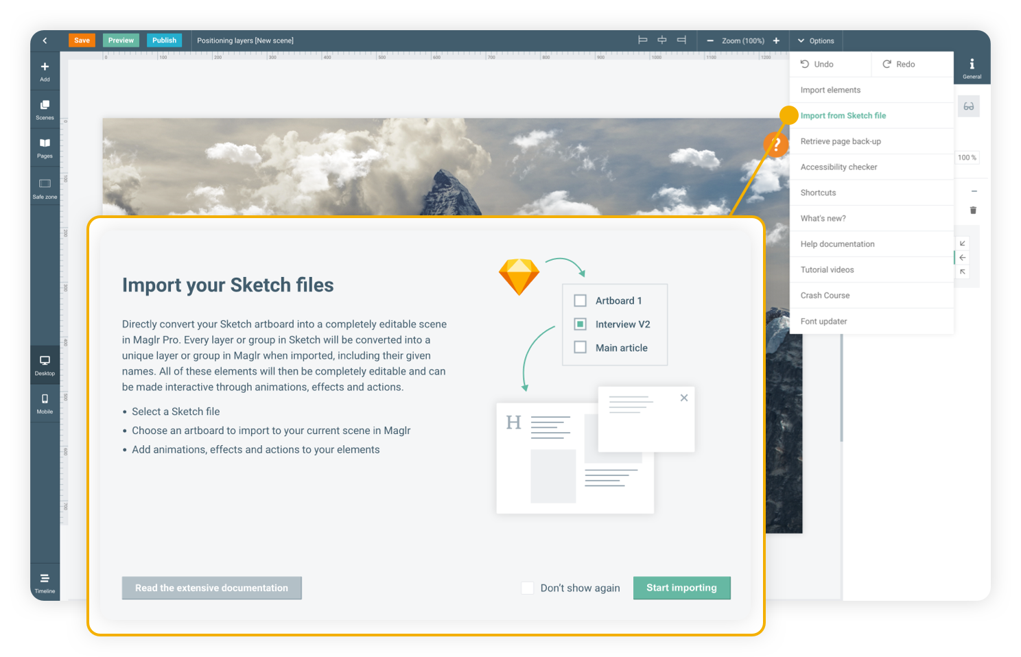 As a Sketch user, it’s possible to directly convert your Sketch artboards into fully editable scenes in Maglr Pro. This allows you to design the pages of your Maglr publication in Sketch first, to then convert them into an interactive publication with Maglr.