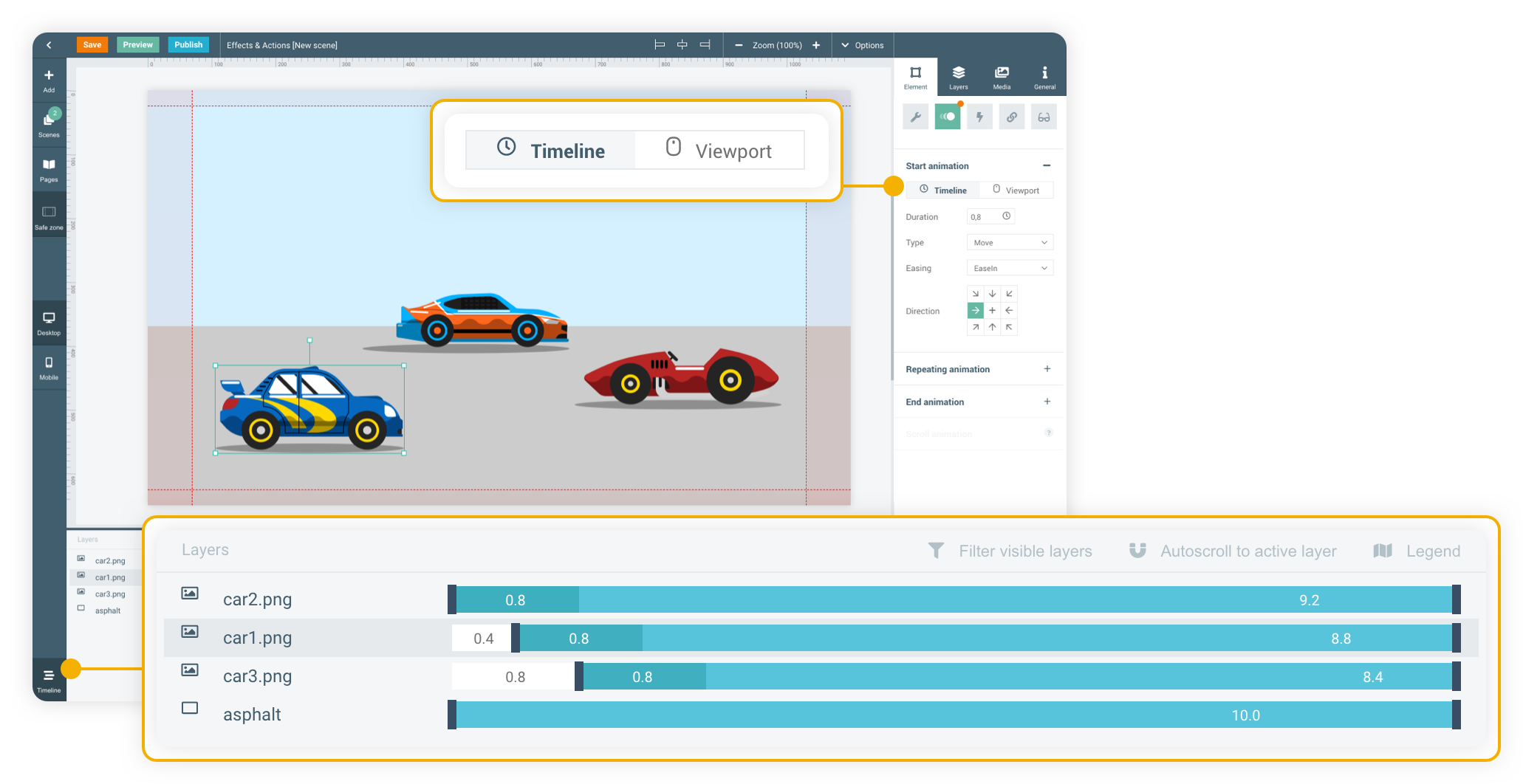 The timeline starts running upon loading the page and can be used to change the timing of the elements on the canvas up to a maximum of 10 seconds. Control when an element should become visible or when it should disappear. Viewport animations are only available on longpages and are only triggered when the viewer scrolls to a predefined point on the page.