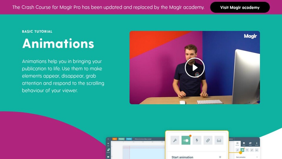 Animations help you in bringing your publication to life. Use them to make elements appear, disappear, grab attention and respond to the scrolling behaviour of your viewer.