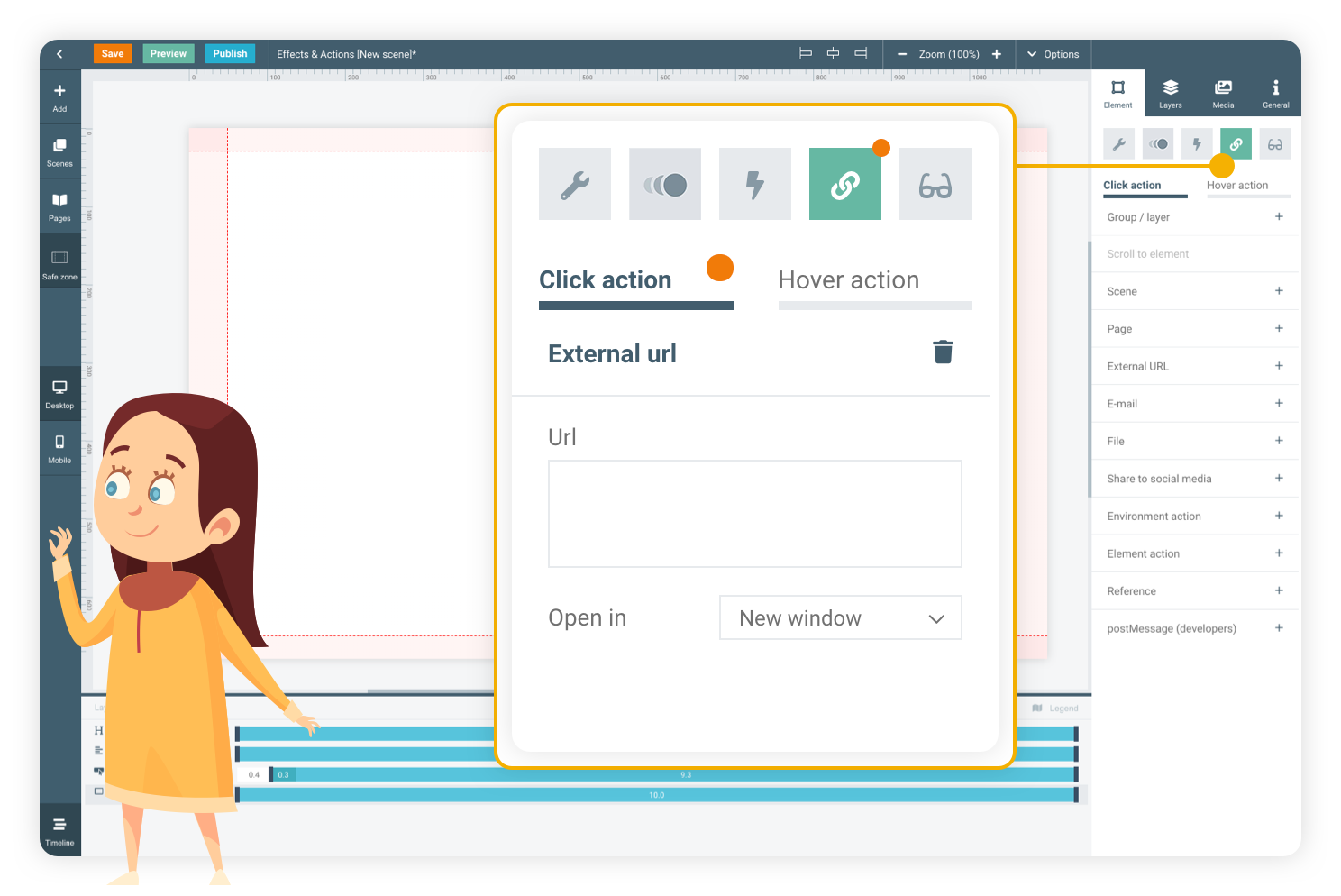 In order to make your viewers interact with the publication, actions can be used. Use hover actions to show or hide other elements. Click actions can be used to apply more types of actions to your elements, like navigating to other pages of the publication or even external sources.
