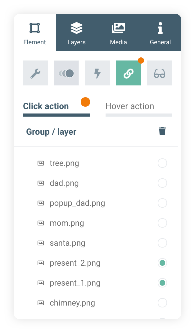 Another way to make viewers interact with your publication, is to perform actions when the element is clicked. In this example, the presents will drop down the chimney when you click on santa.