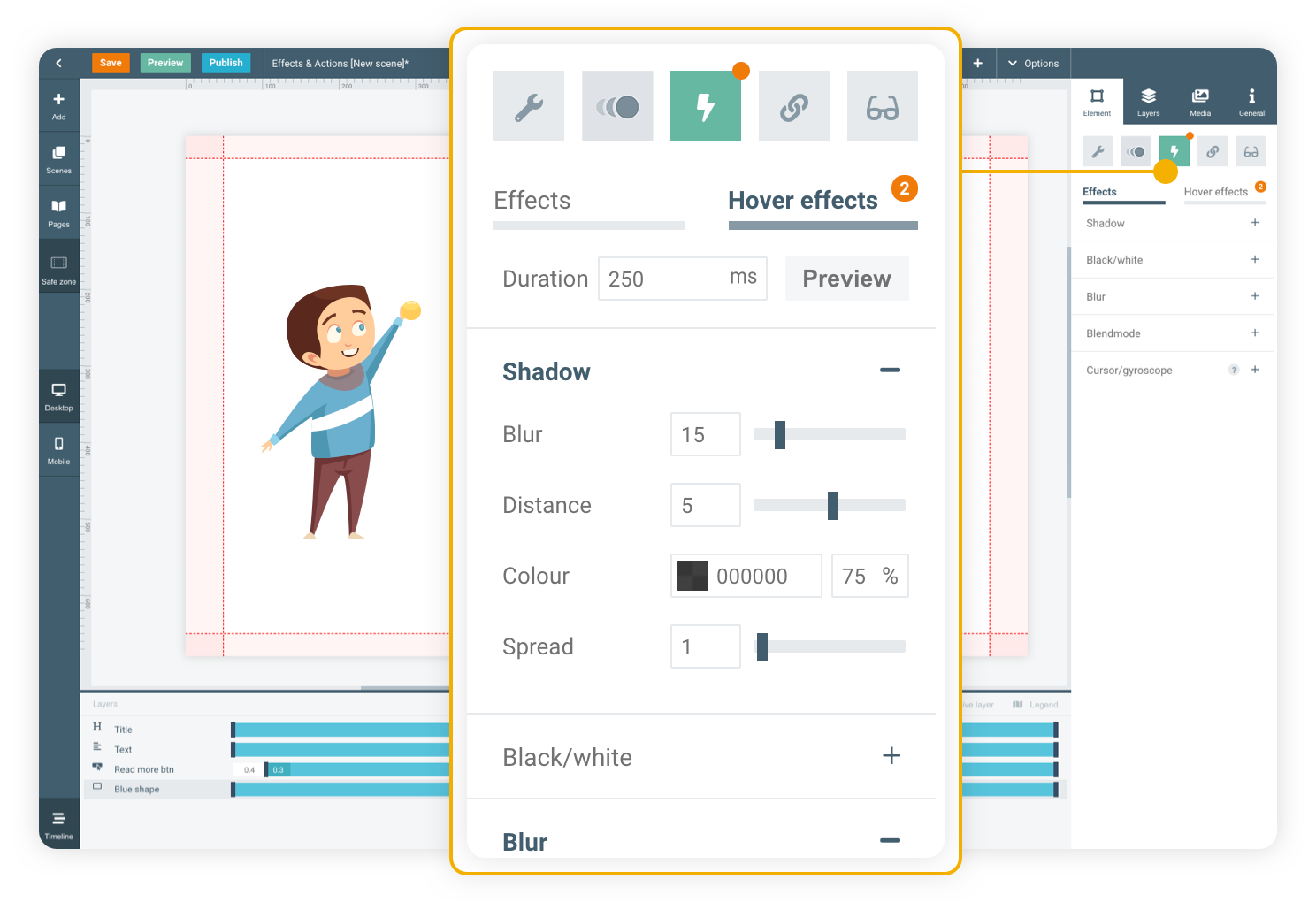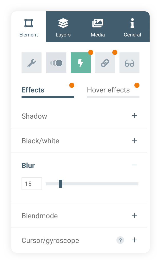 Use effects like shadows, blur or gyro to make your element stand out from others in Your scene. Then change its colour or move it via hover effects to invite your viewer to interact with the element. Multiple effects can be added to a single element.