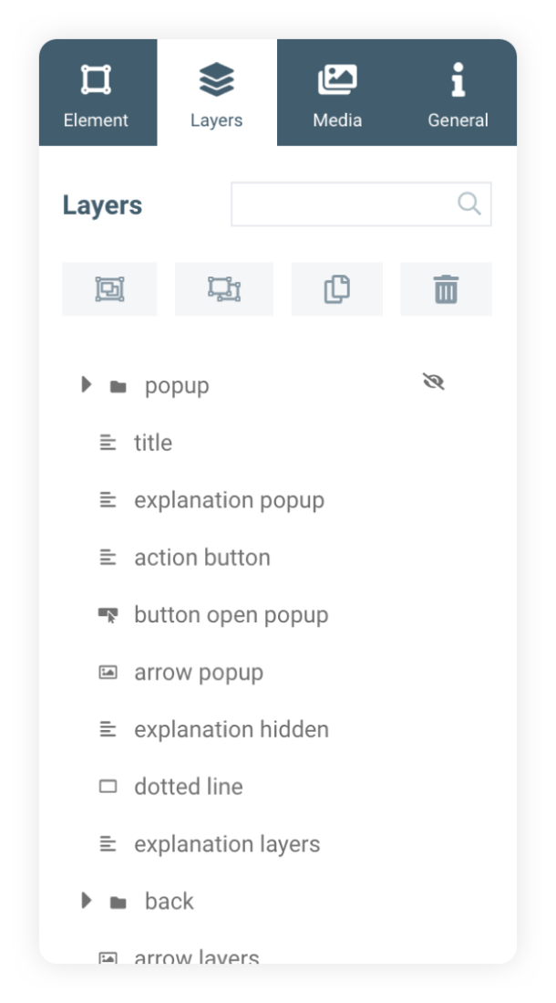 Use the ‘lock’-icon to disable the editing of the element and use the 'eye'-icon to hide groups & layers. Elements and groups can be hidden when initially viewing the page, only to make them appear after your viewer interacts with another element or group (via a hover- or click action).