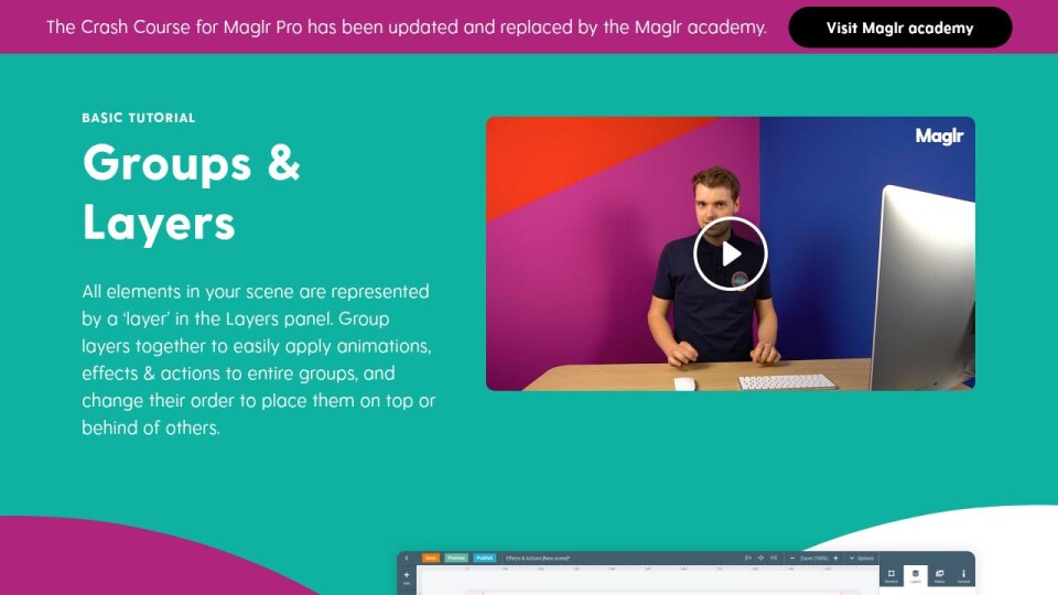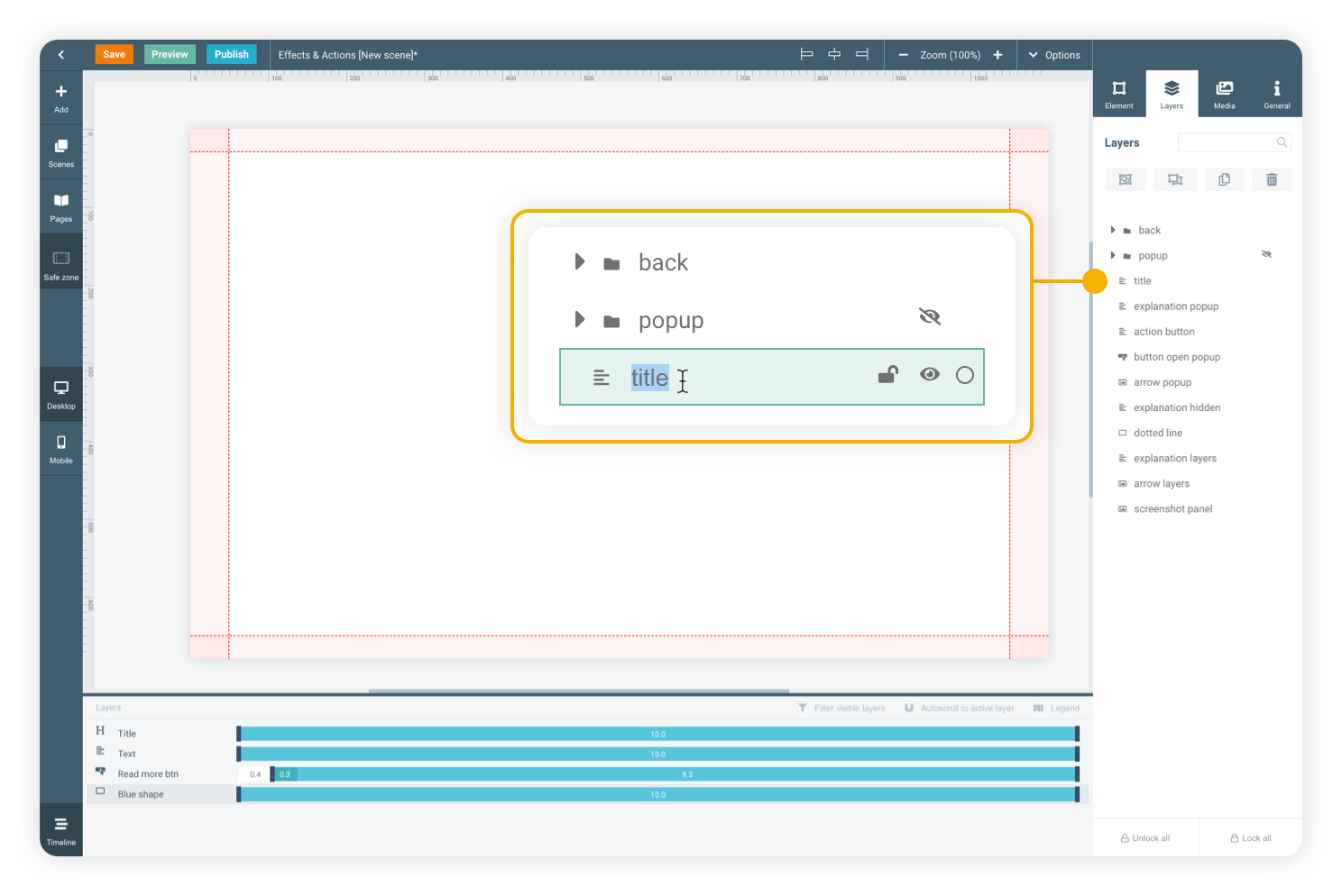 All elements in your scene are represented by a ‘layer’ in the Layers panel. Group layers together to easily apply animations, effects & actions to entire groups, and change their order to place them on top or behind of others.