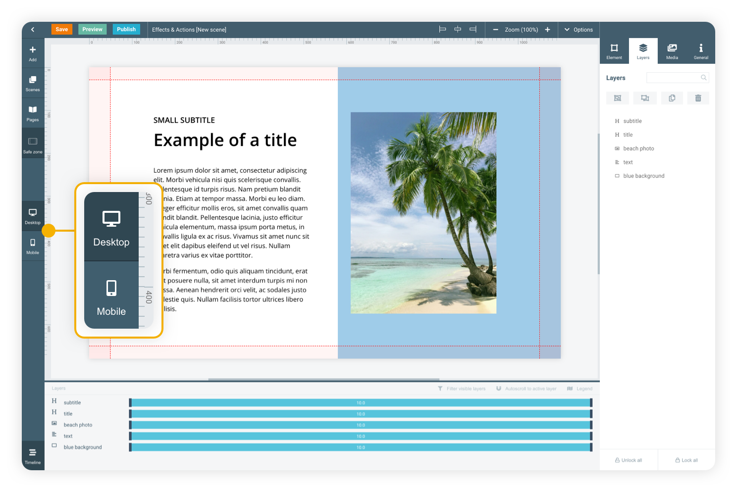 In Maglr Pro, your design always starts with a desktop (landscape) version. You can then translate the designed scene into a mobile version to make it fit on mobile (portrait) devices.