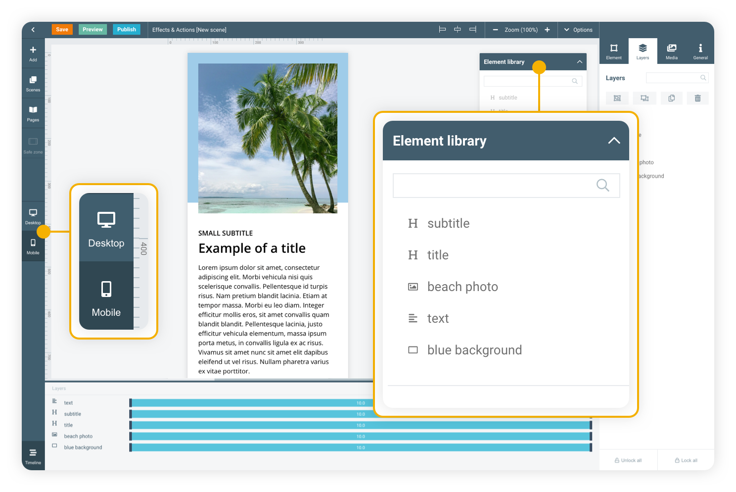 The element library will help you translate all used elements from desktop to mobile and keep them connected. This means that, when you edit an element on the desktop version, the mobile version will automatically update as well. Changes on mobile are done independently from the desktop version, so any changes you make on mobile will not be visible on the desktop version.