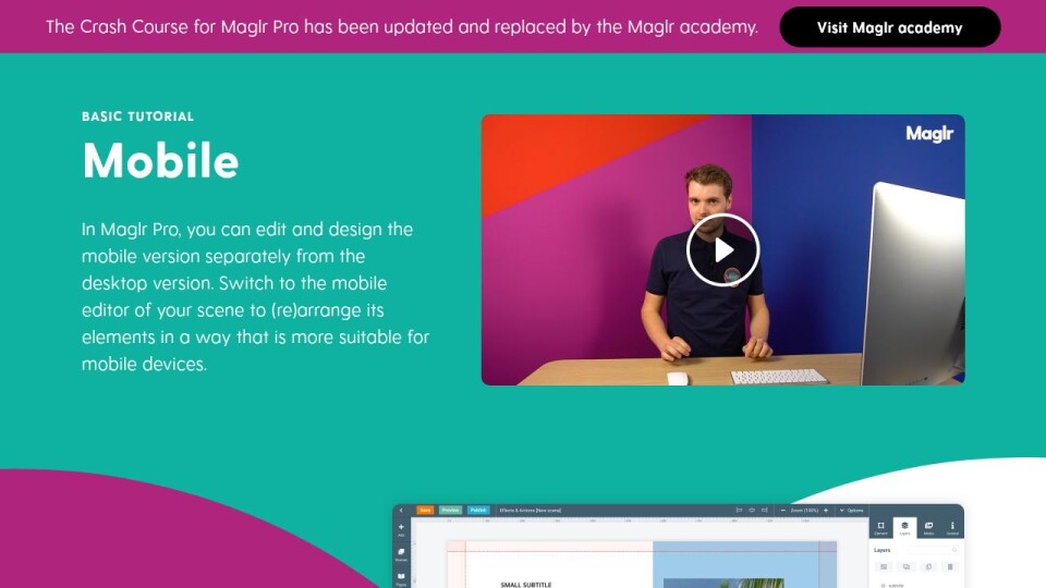 In Maglr Pro, you can edit and design the mobile version separately from the desktop version. Switch to the mobile editor of your scene to (re)arrange its elements in a way that is more suitable for mobile devices.
