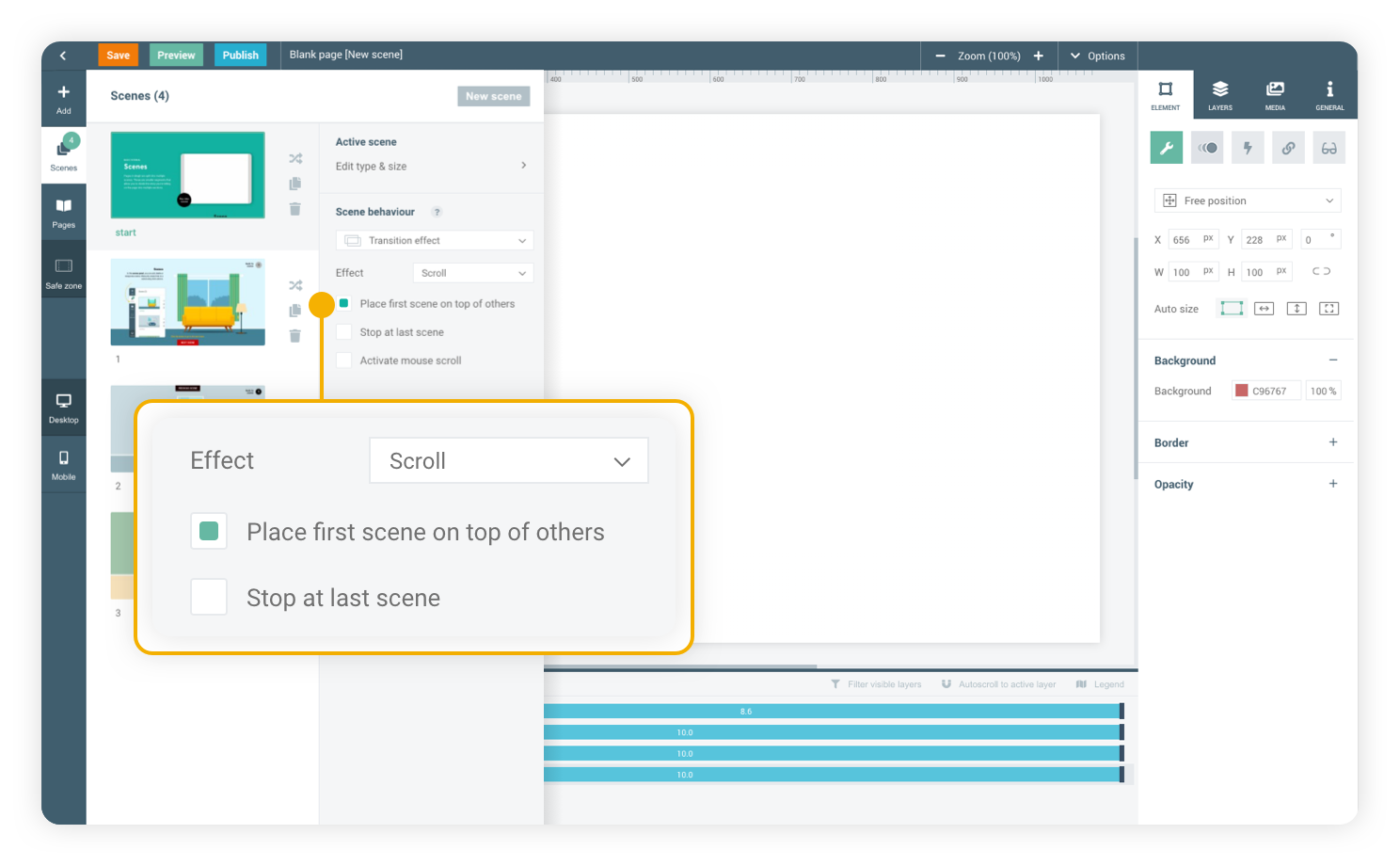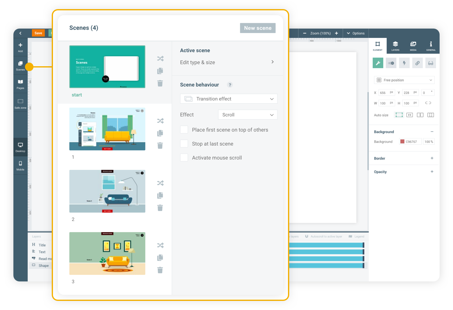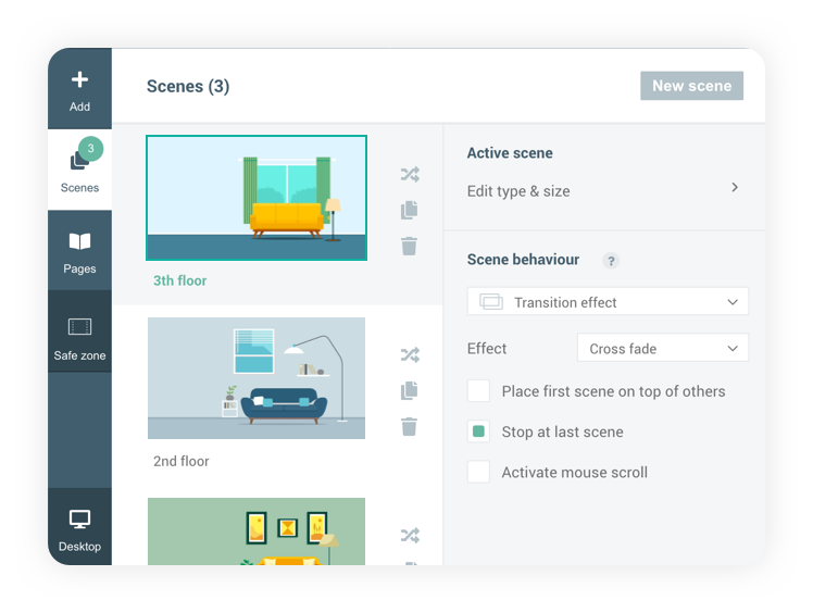 Each scene has its own settings, such as size, safe zone and even its own Layer panel. Via the Scenes panel you can change their behaviour, in order to determine the way your viewers navigate through them when viewing the page. This can be done via mouse scroll or manual buttons, and you can even apply effects to scene transitions.