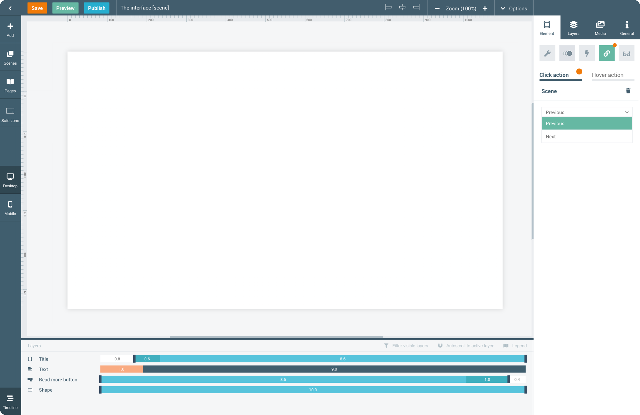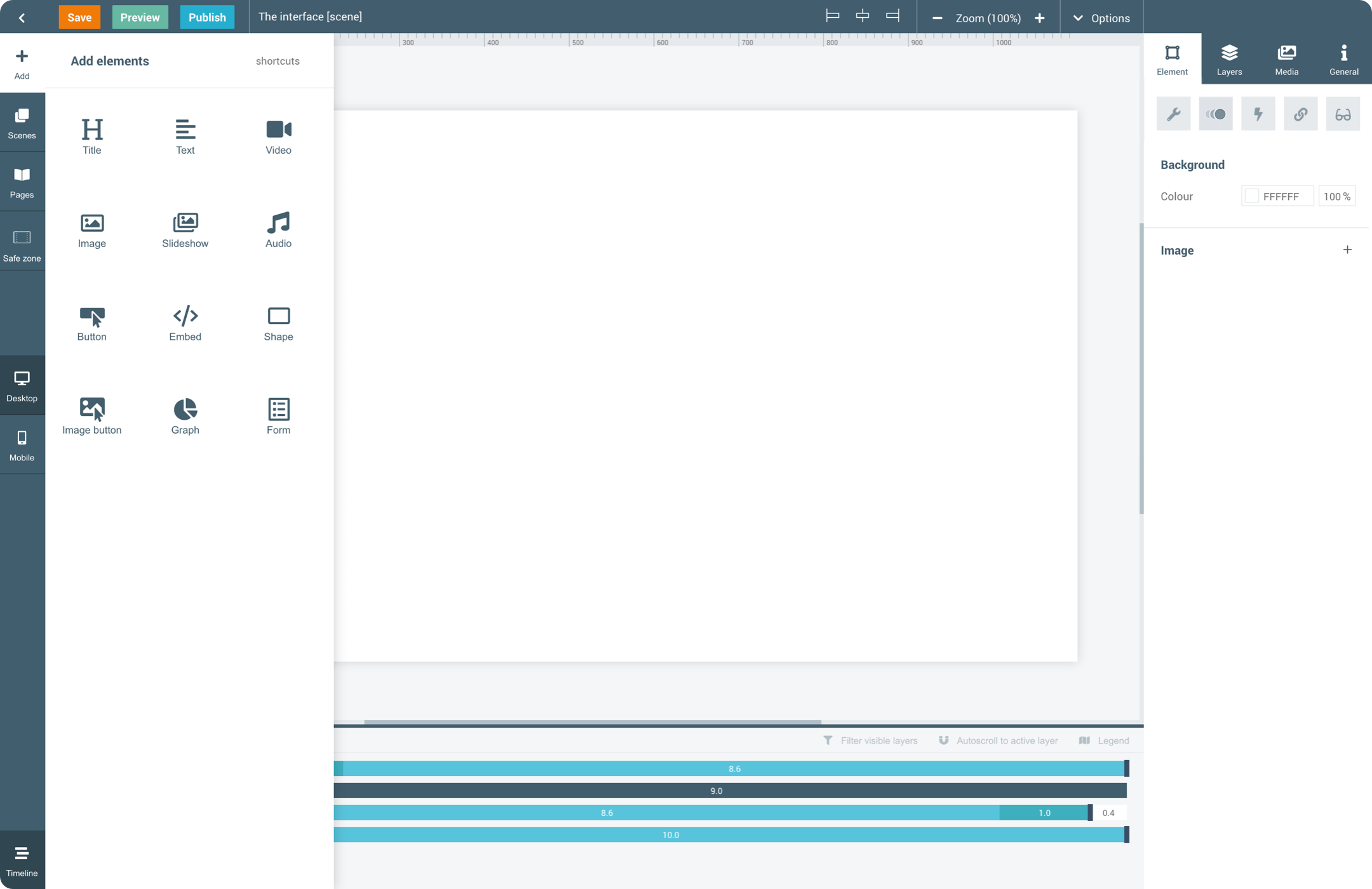 Add new elements to your canvas or control your view by switching between scenes, pages, or the mobile version.