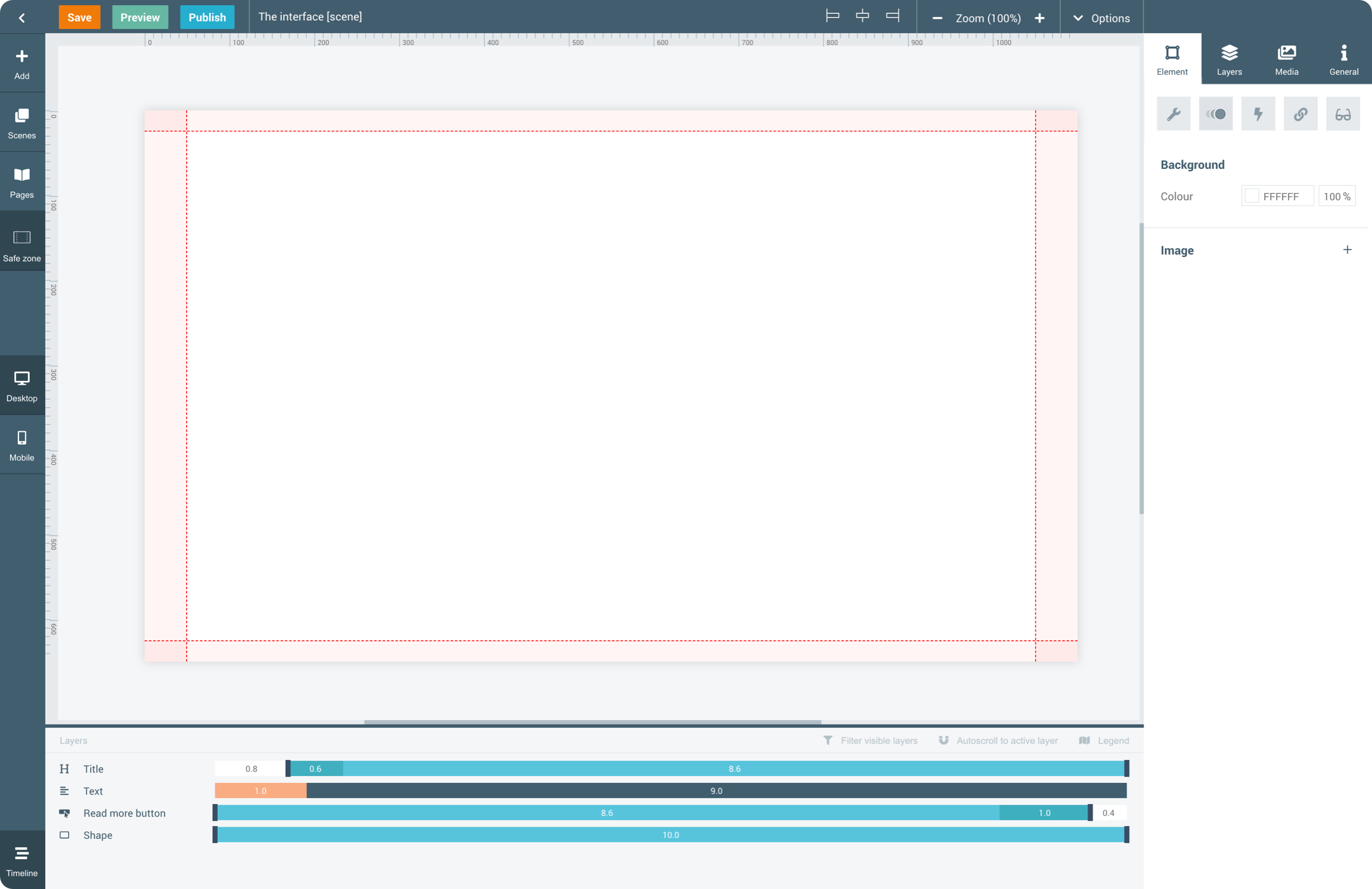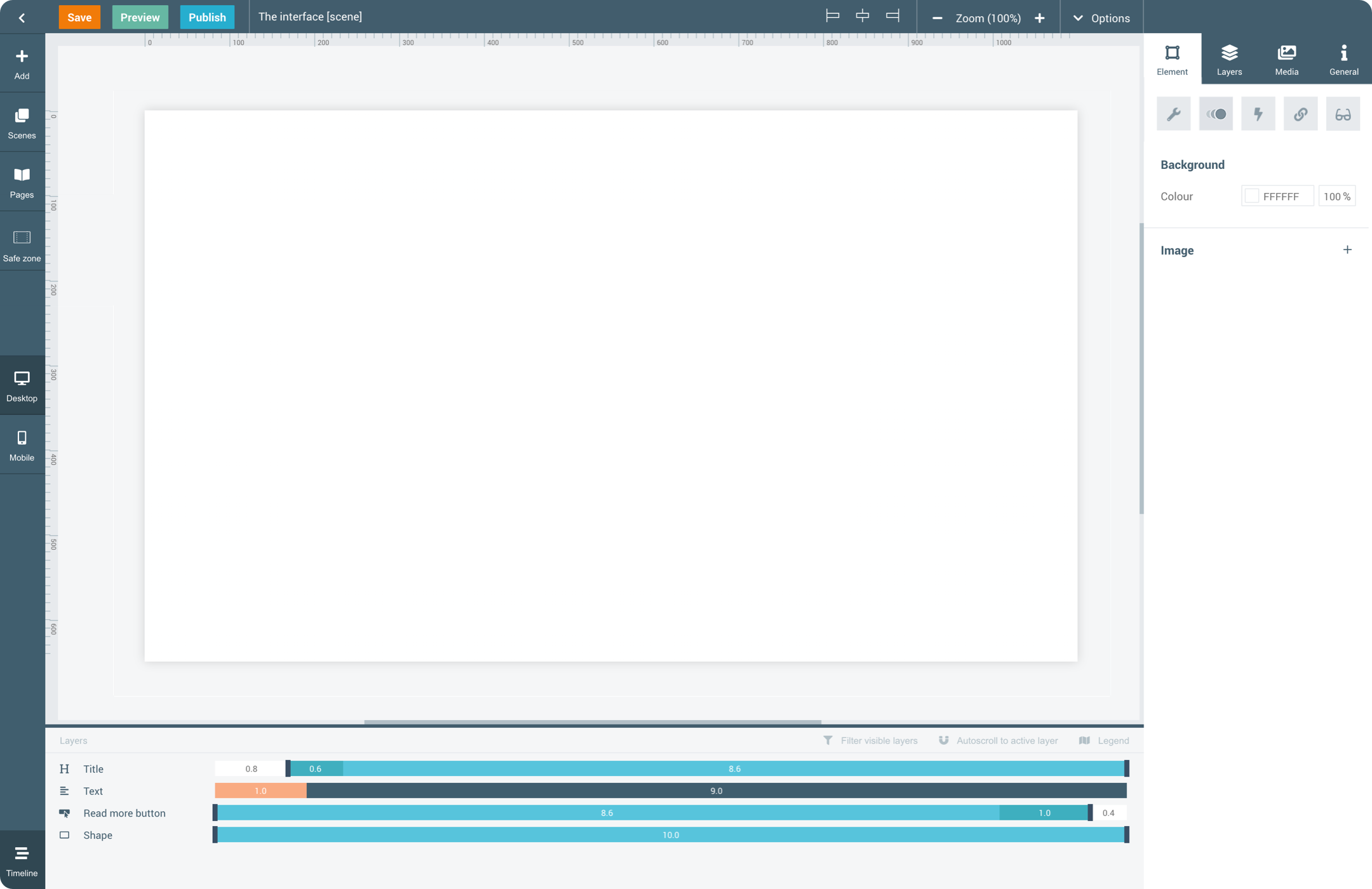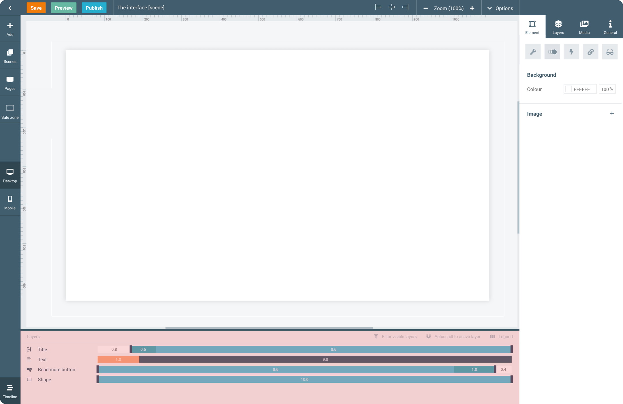 This is the workspace where you’ll control and configure your elements, layers, media and general settings. Use the Layers-panel to rearrange your elements and configure them via the Element-panel. Upload media using the Media-tab and adjust scene & page settings via the General-panel.