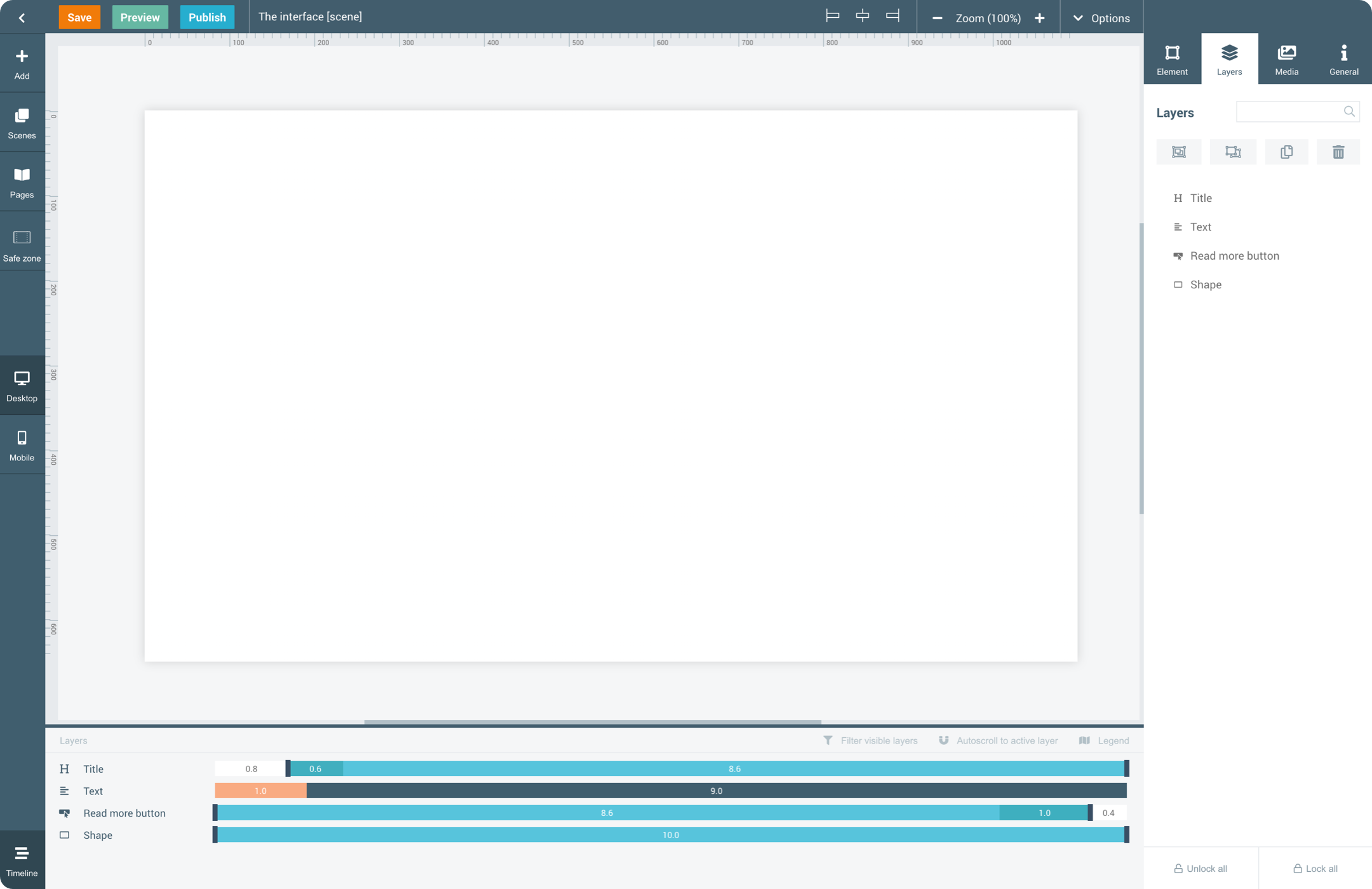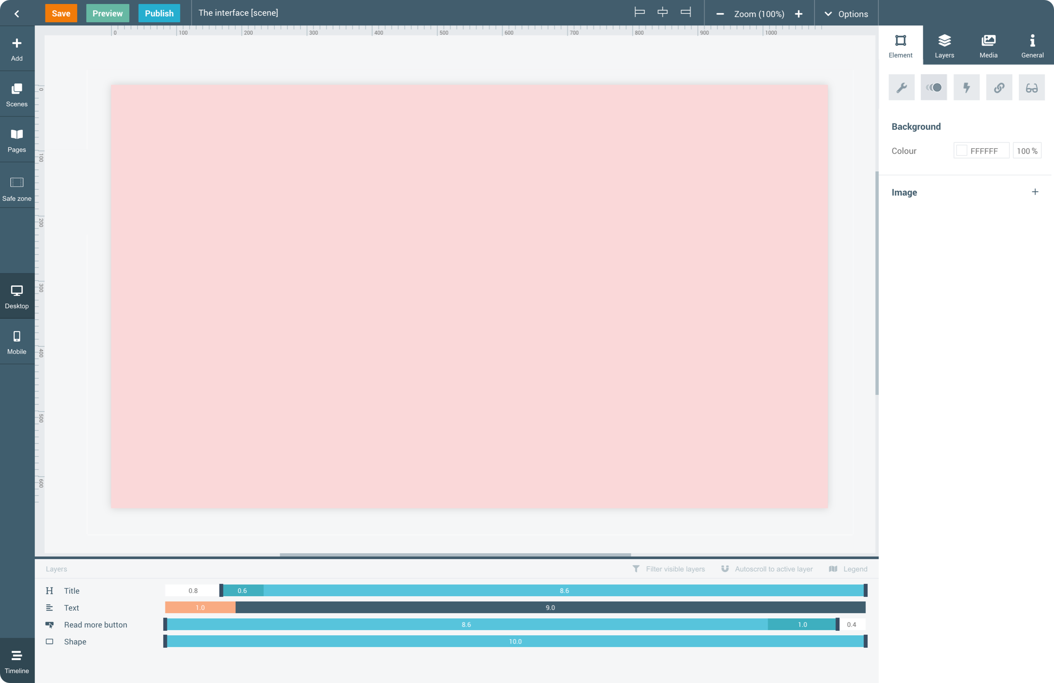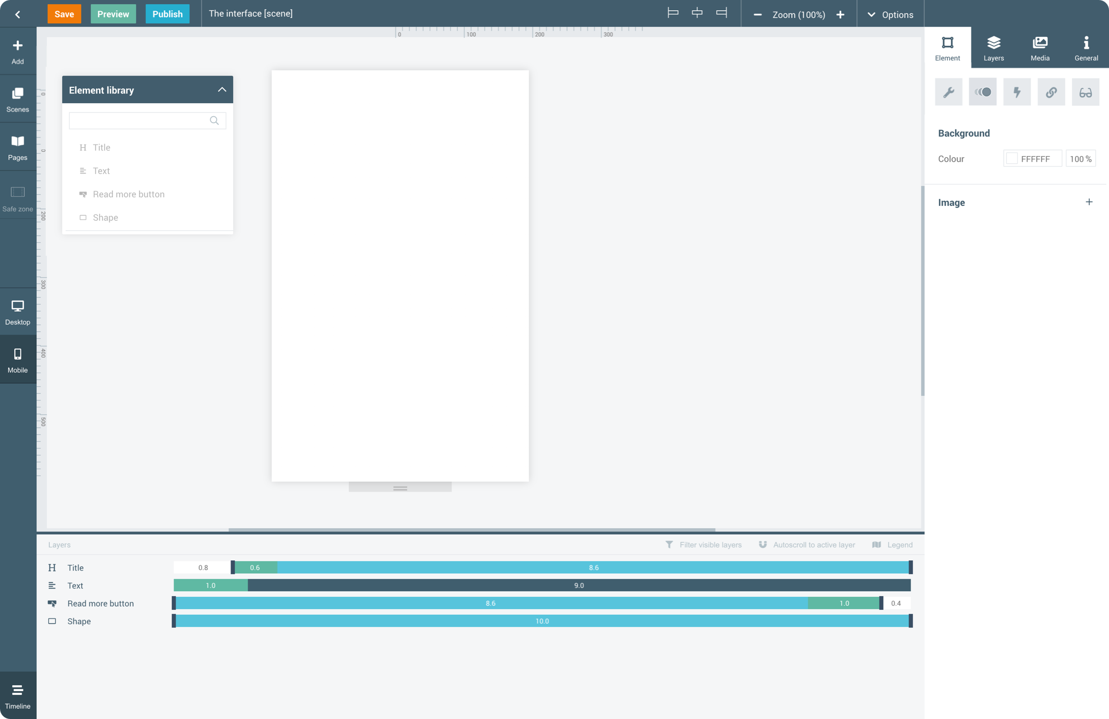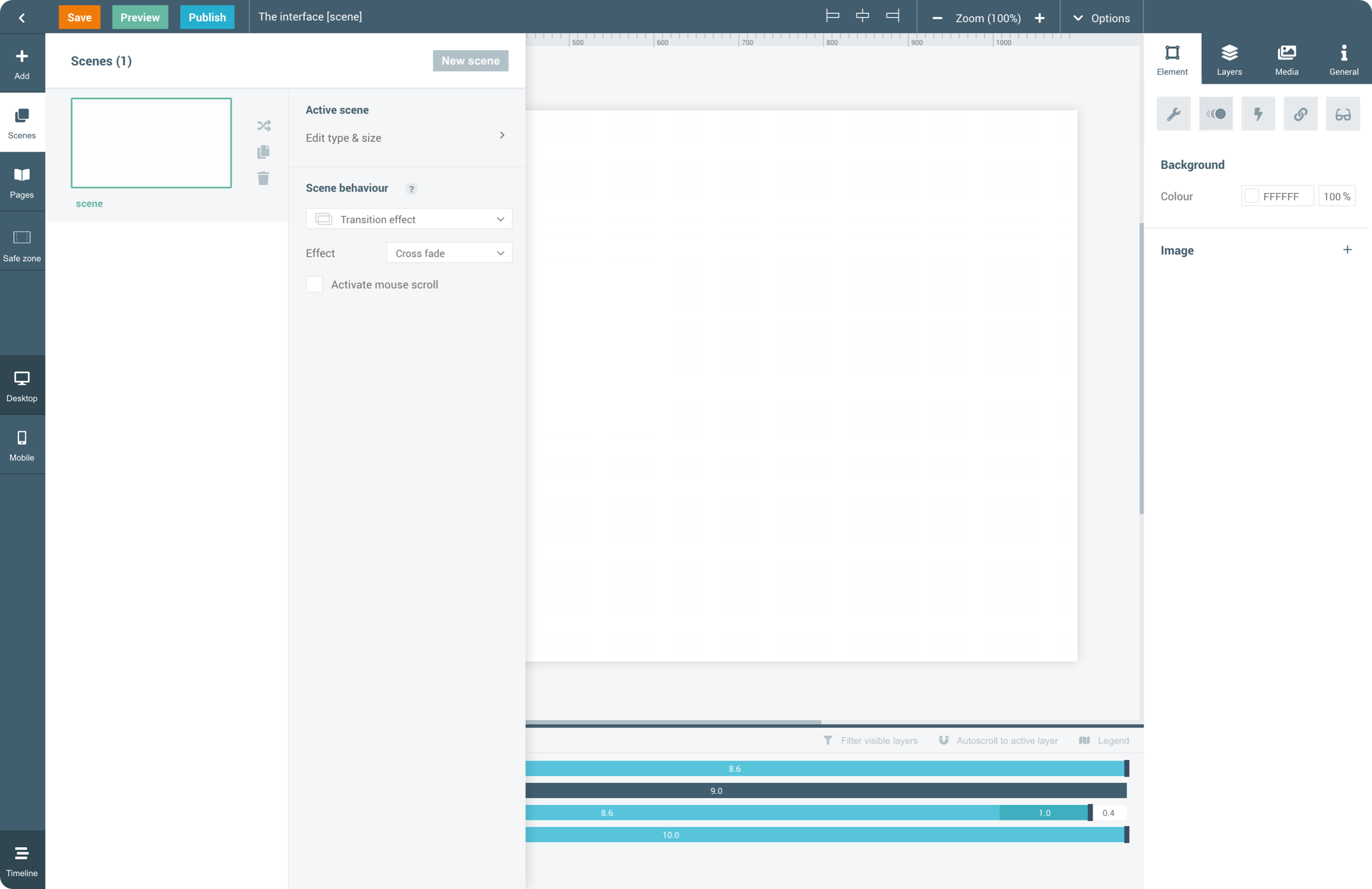 This is the workspace where you’ll control and configure your elements, layers, media and general settings. Use the Layers-panel to rearrange your elements and configure them via the Element-panel. Upload media using the Media-tab and adjust scene & page settings via the General-panel.