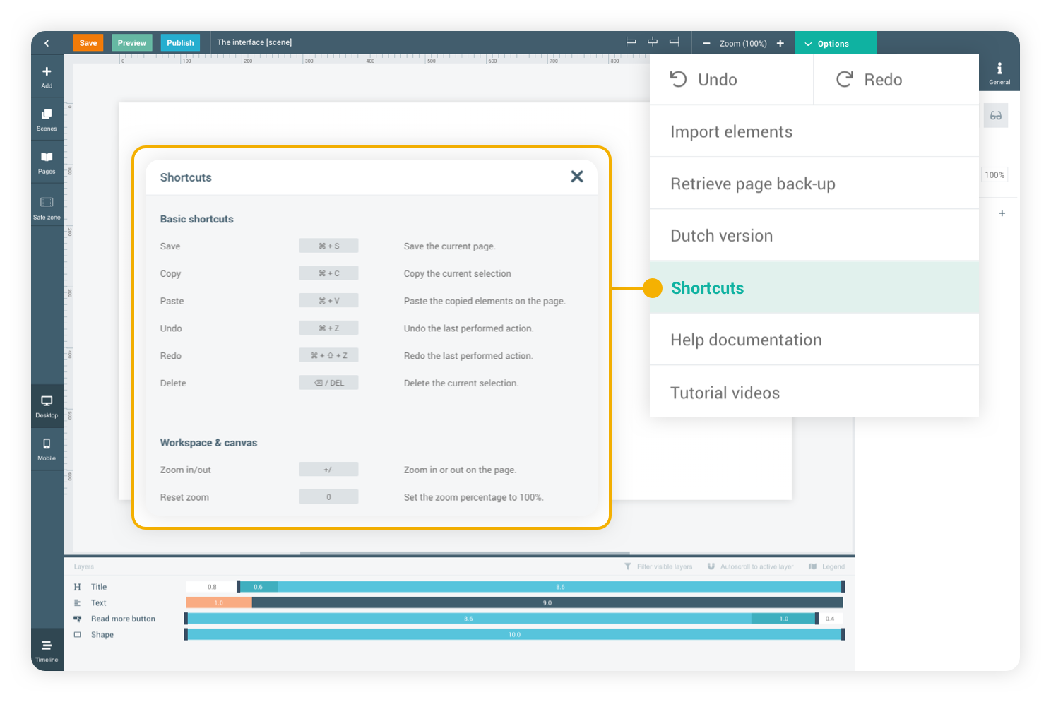 Keyboard shortcuts are a great way to improve your workflow in Maglr Pro. Use them to quickly perform actions, like placing an element or moving them across the current scene. You can find the shortcuts directly inside the editor or by clicking here.