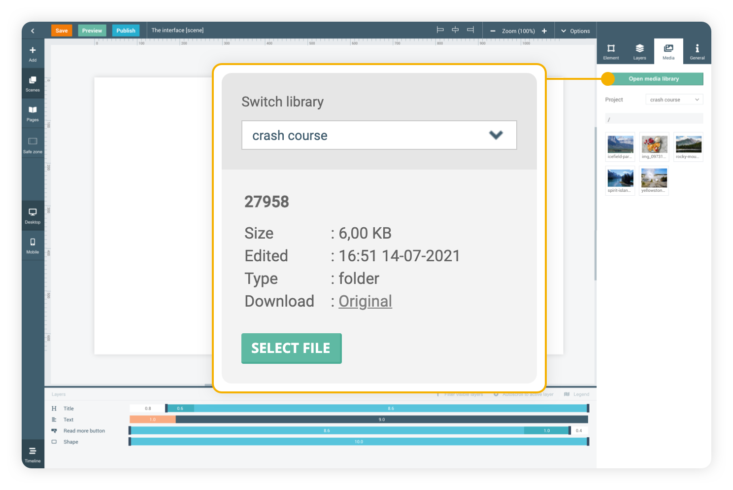 Upload media by simply dragging the desired media file to the library or directly to the current scene.