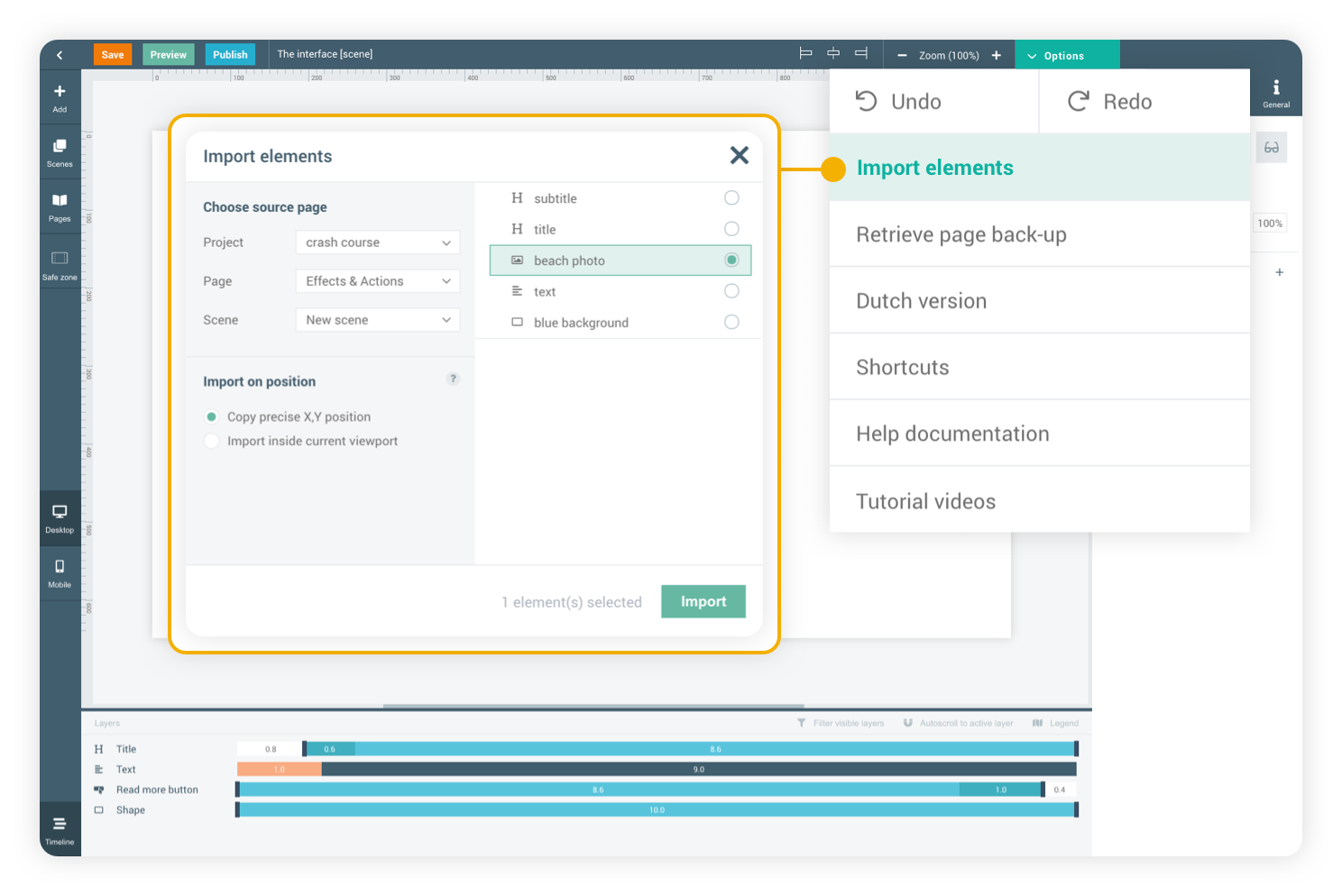 If you would like to import many elements at the same time, or if you would like them to keep their original position, you can import them using the 'import elements' functionality of the Pro editor.