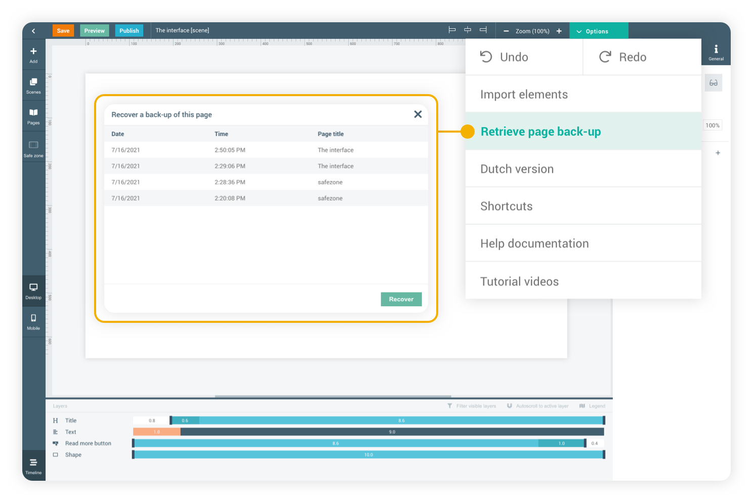 Restoring an earlier back-up of the page can be done at all times while working in the editor.